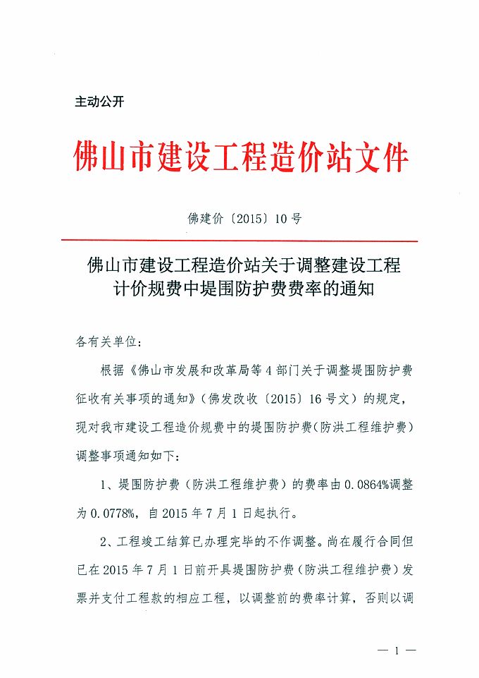 佛山市建設工程造價站關于調整建設工程計價規費中堤圍防護費費率的通知