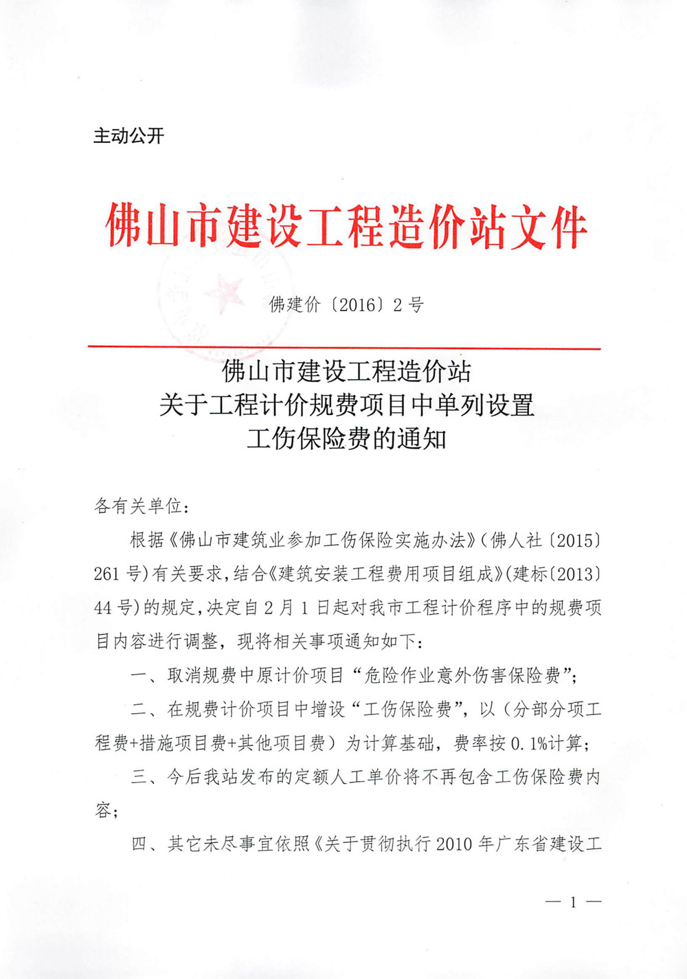佛山市建設工程造價站關于工程計價規費項目中單列設置工傷保險費的通知