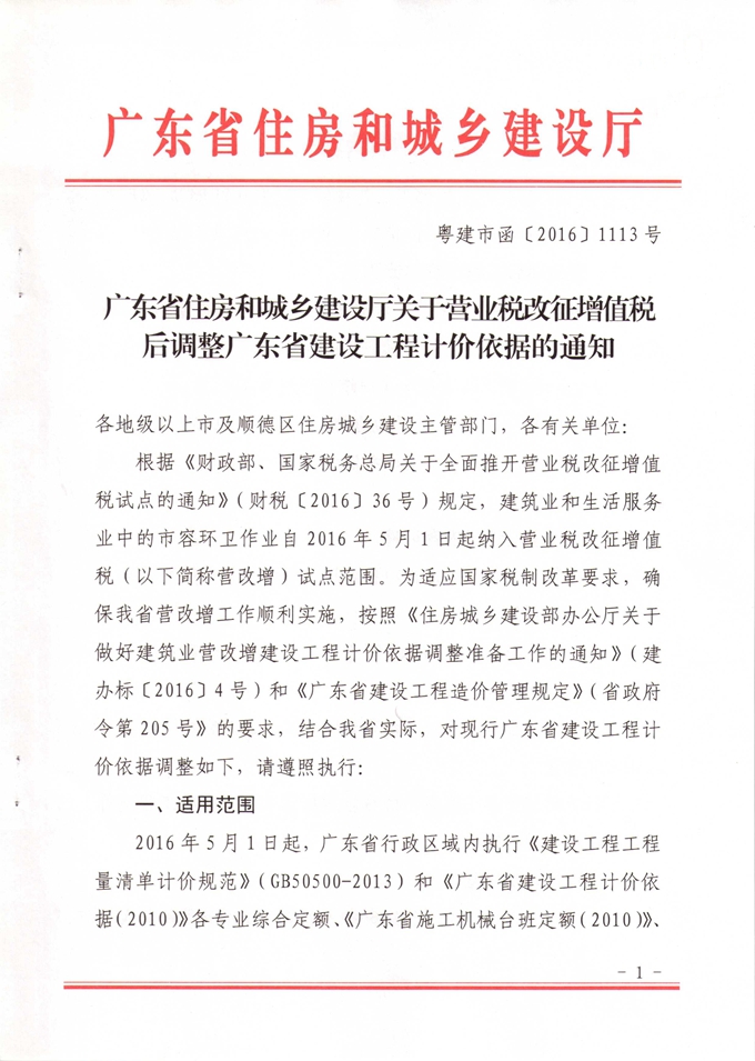 廣東省住房和城鄉建設廳關于營業稅改征增值稅后調整廣東省建設工程計價依據的通知
