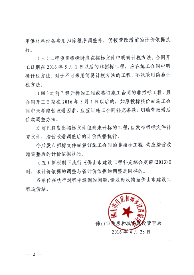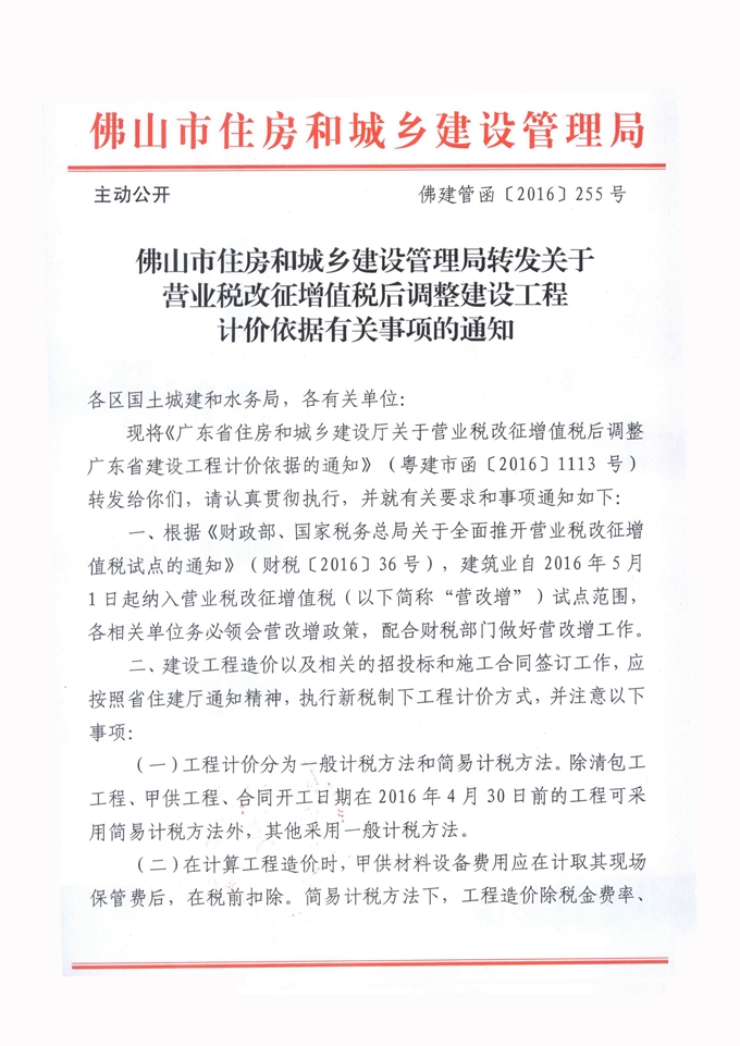 佛山市住房和城鄉建設管理局轉發關于營業稅改征增值稅后調整建設工程計價依據有關事項的通知