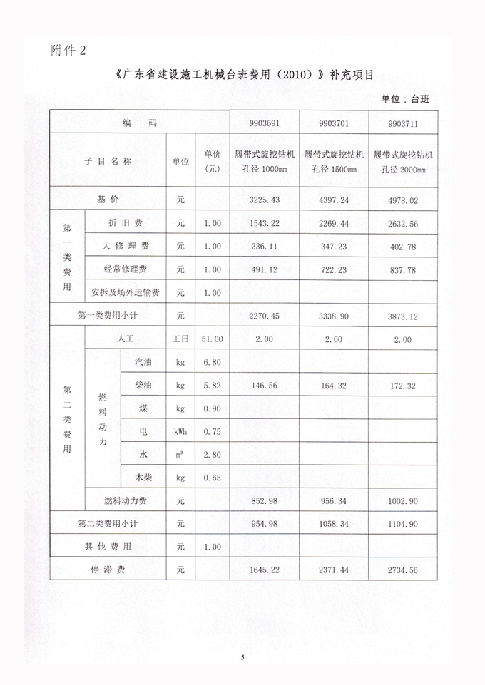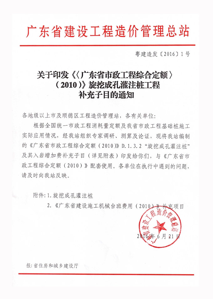 關于印發《廣東省市政工程綜合定額(2010)》旋挖成孔灌注樁工程補充子目的通知