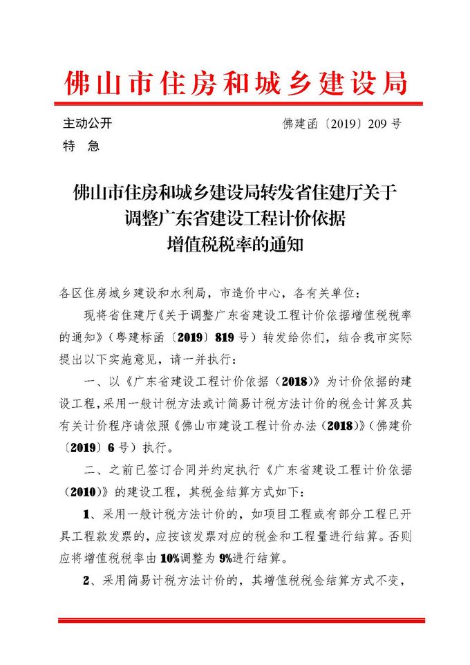佛山市住房和城鄉建設局轉發省住建廳關于調整廣東省建設工程計價依據增值稅稅率的通知