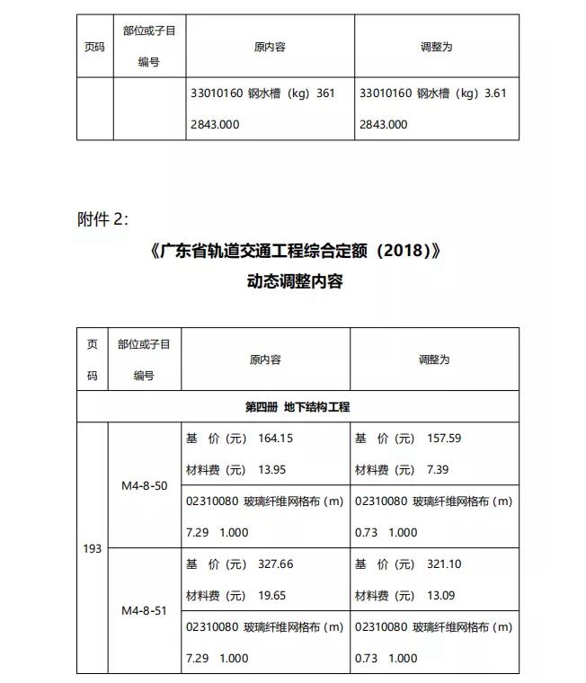 2、《廣東省軌道交通工程綜合定額(2018)》動態調整內容。