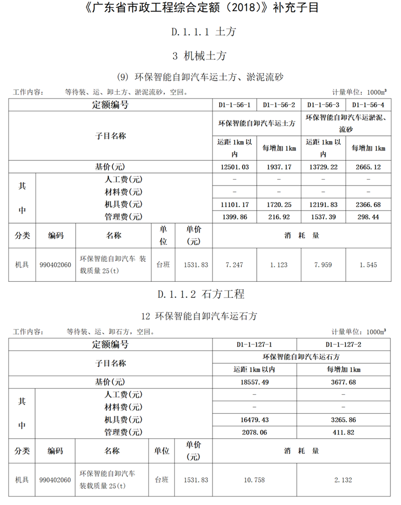 3.本補充定額子目機械臺班單價參照《廣東省建設工程施工機具臺班費用編制規則2018》“990402060 環保智能自卸汽車”計取;管理費參照《廣東省城市軌道交通工程綜合定額2018》《廣東省市政工程綜合定額2018》《廣東省城市地下綜合管廊工程綜合定額2018》“附錄二 管理費分攤費率表”中相關專業冊管理費分攤費率計取。