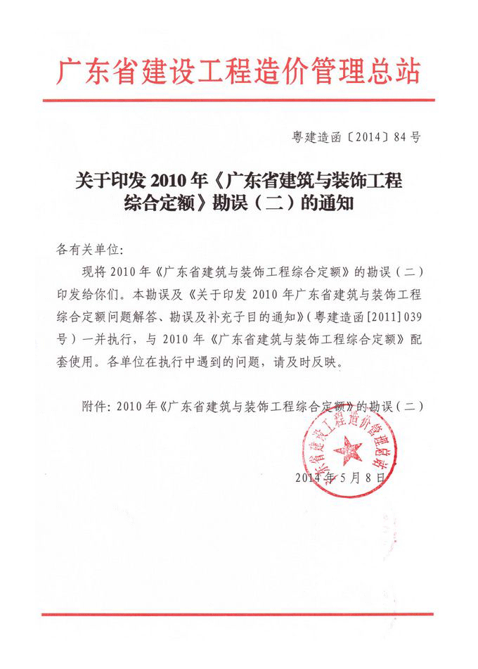關于印發2010年《廣東省建筑與裝飾工程綜合定額》勘誤(二)的通知