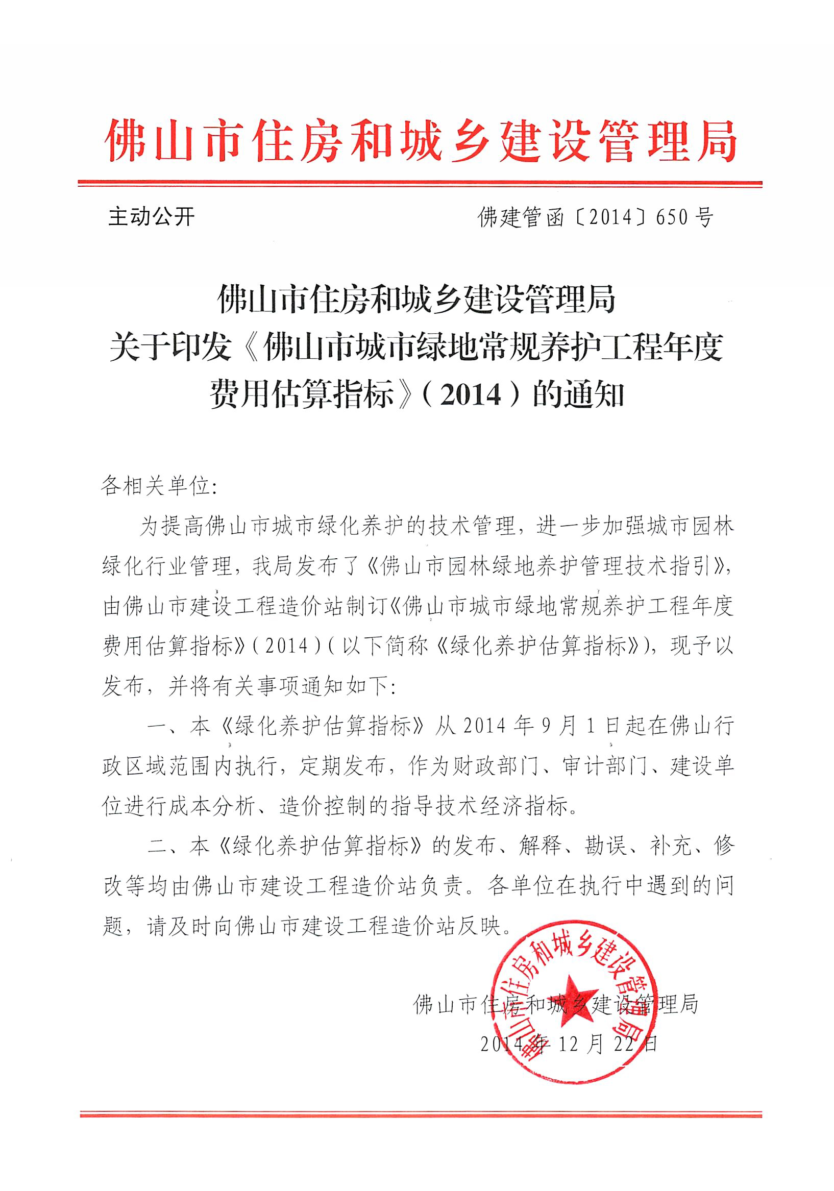 佛山市住房和城鄉建設管理局關于印發《佛山市城市綠地常規養護工程年度費用估算指標》(2014)的通知