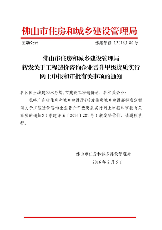 佛山市住房和城鄉(xiāng)建設管理局轉發(fā)關于工程造價咨詢企業(yè)晉升甲級資質實行網(wǎng)上申報和審批有關事項的通知