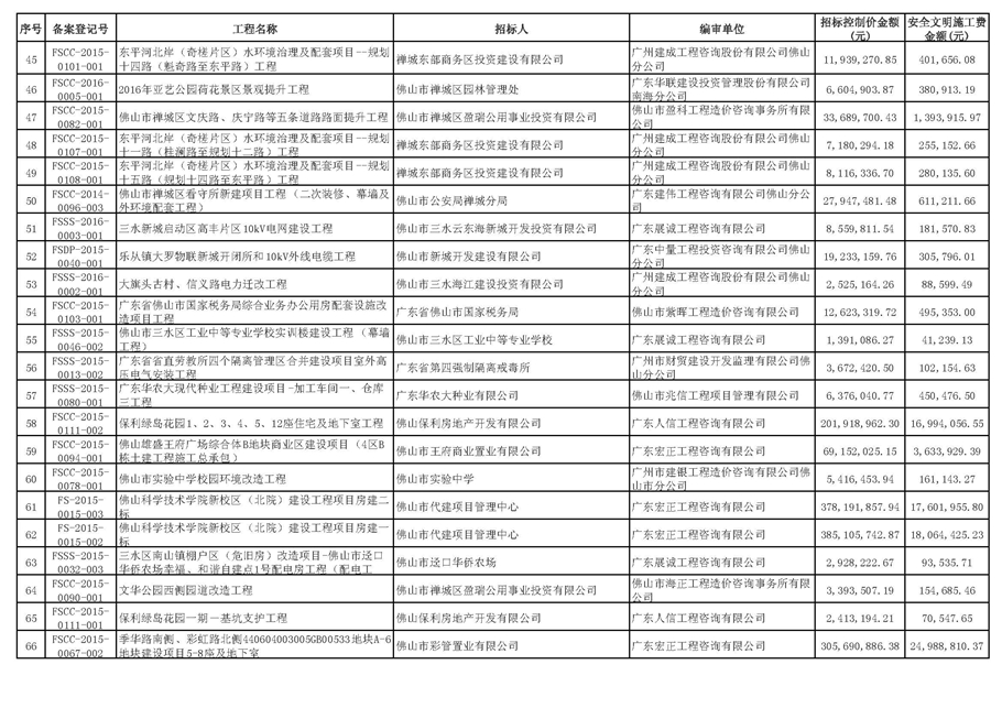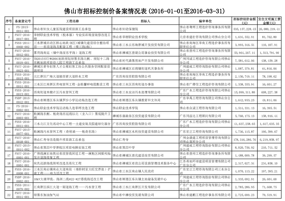 佛山市招標控制價備案情況表(2016-01-01至2016-03-31)