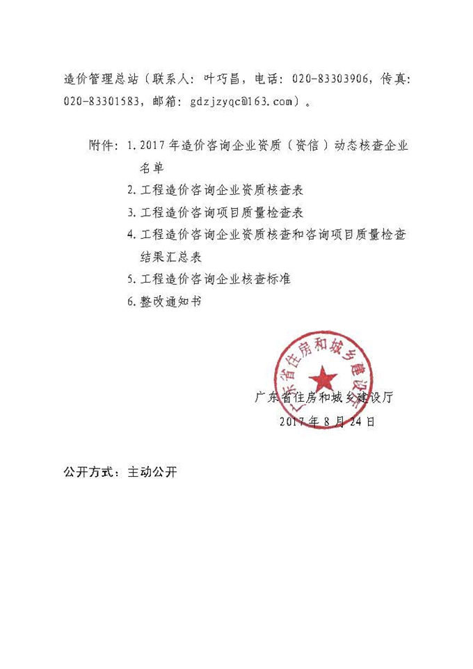 附件:1.2017年造價咨詢企業資質(資信)動態核查企業名單2.工程造價咨詢企業資質核查表3.工程造價咨詢項目質量檢查表4.工程造價咨詢企業資質核查和咨詢項目質量檢查結果匯總表5.工程造價咨詢企業核查標準6.整改通知書