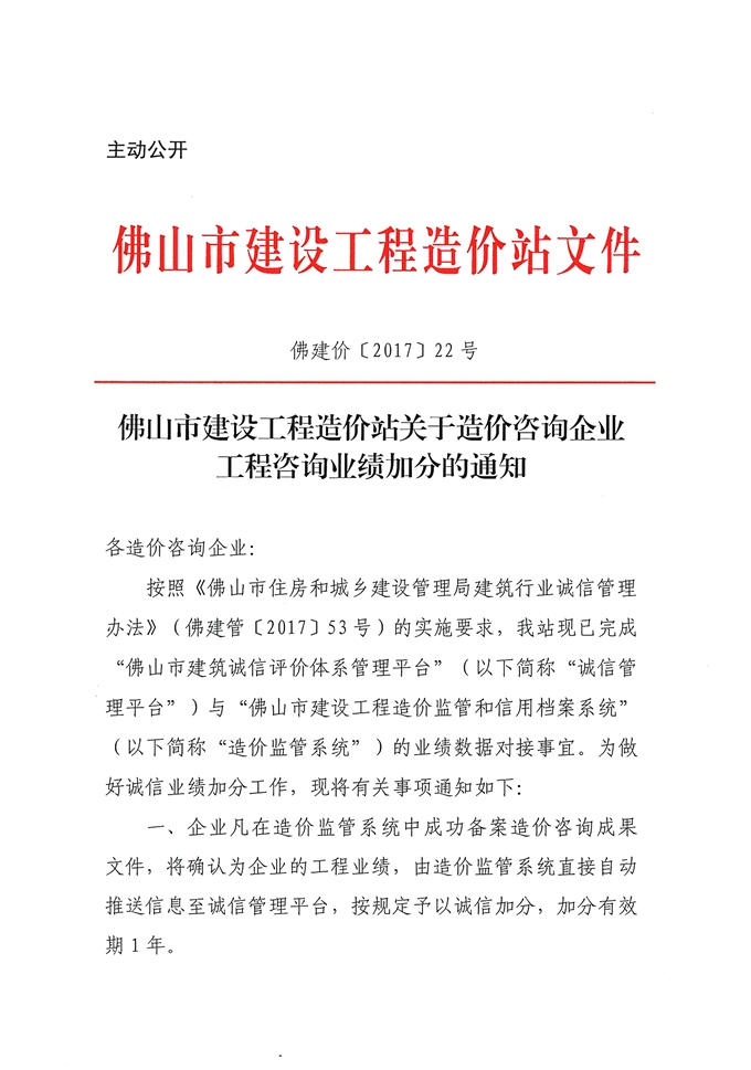 佛山市建設(shè)工程造價(jià)站關(guān)于造價(jià)咨詢企業(yè)工程咨詢業(yè)績(jī)加分的通知