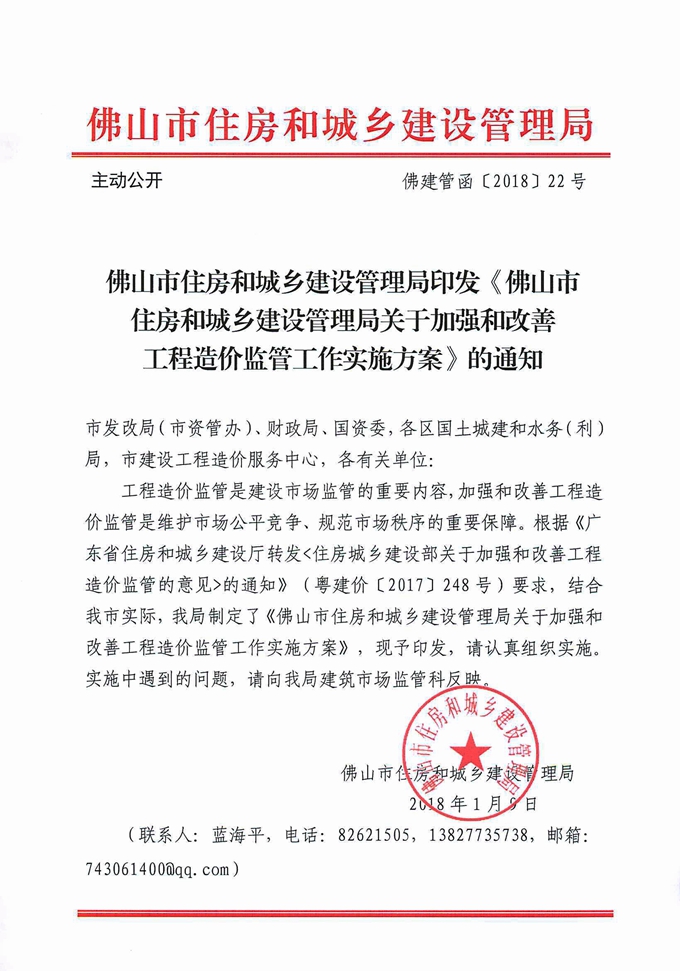 佛山市住房和城鄉建設管理局印發《佛山市住房和城鄉建設管理局關于加強和改善工程造價監管工作實施方案》的通知