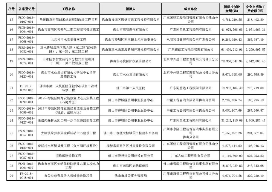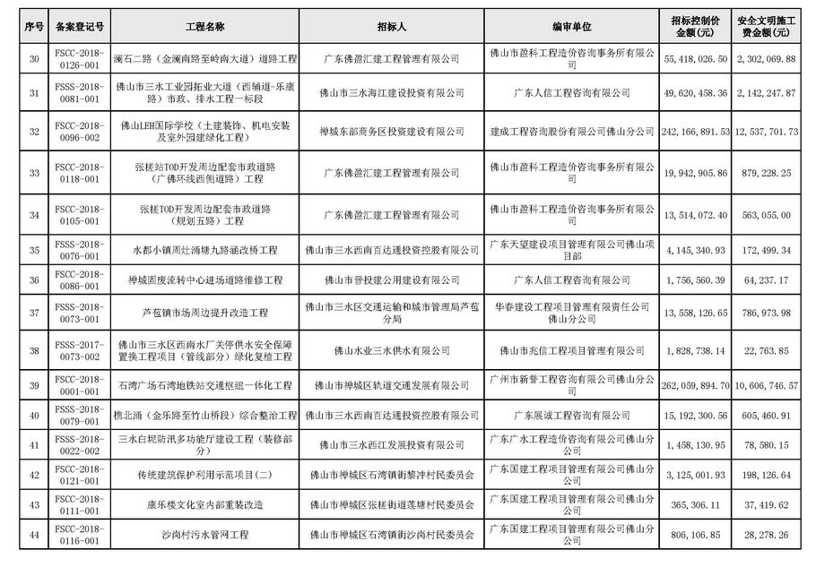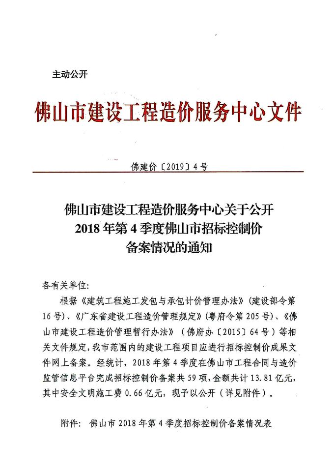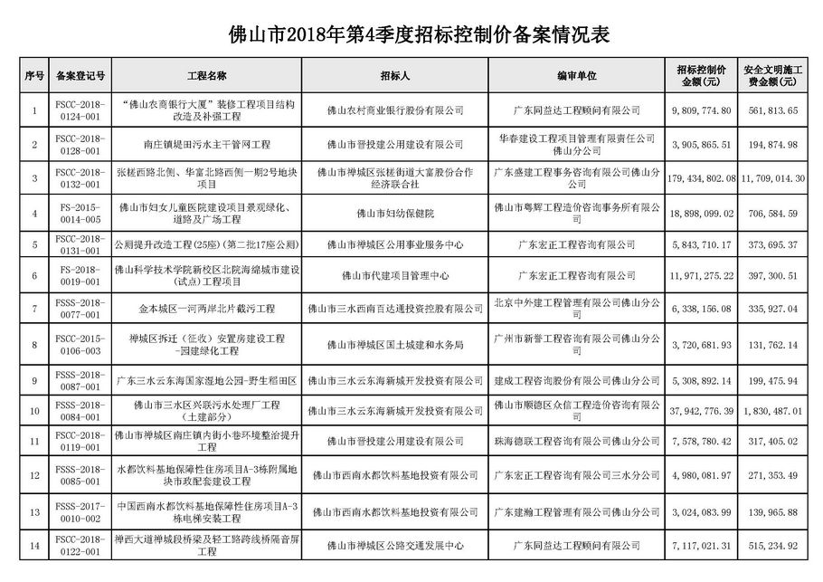 佛山市建設工程造價服務中心關于公布2018年第4季度佛山市招標控制價備案情況的通知