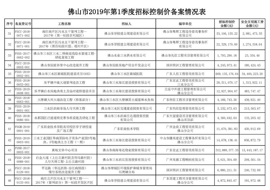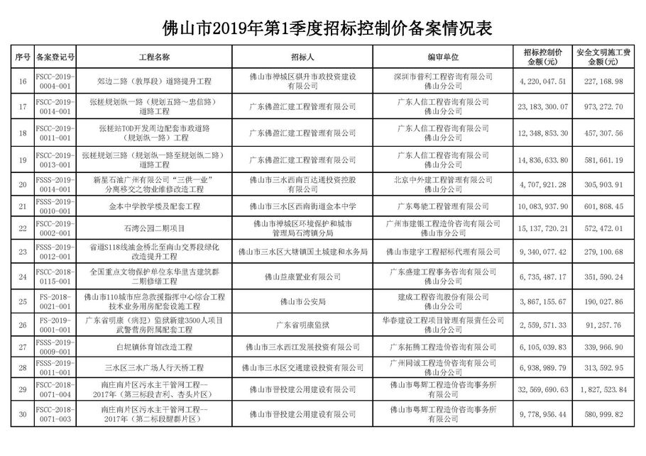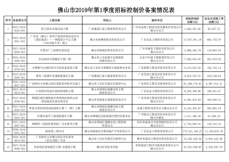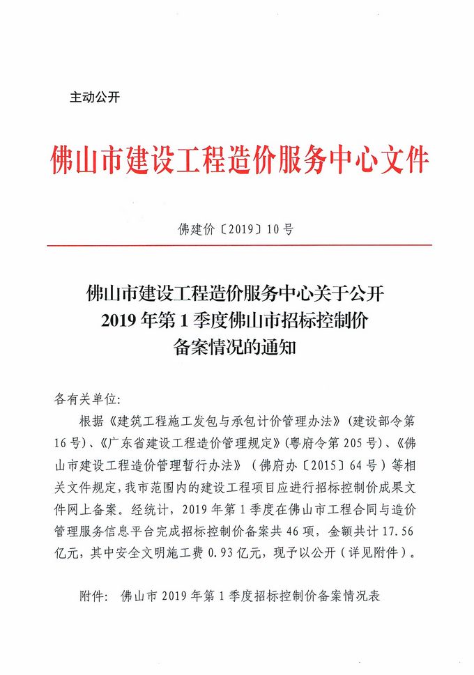 佛山市建設(shè)工程造價服務(wù)中心關(guān)于公布2019年第1季度佛山市招標控制價備案情況的通知