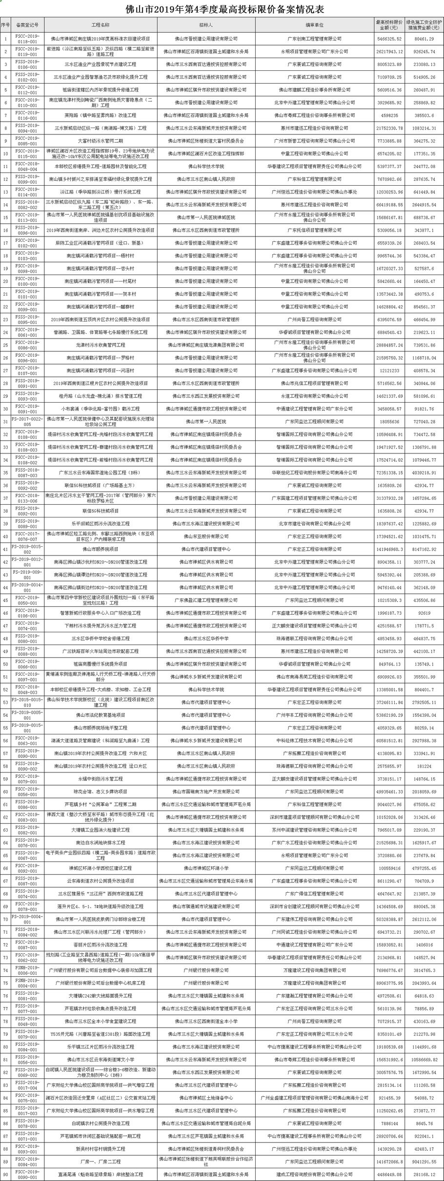 佛山市建設工程造價服務中心關于公開2019年第4季度佛山市最高投標限價備案情況的通知