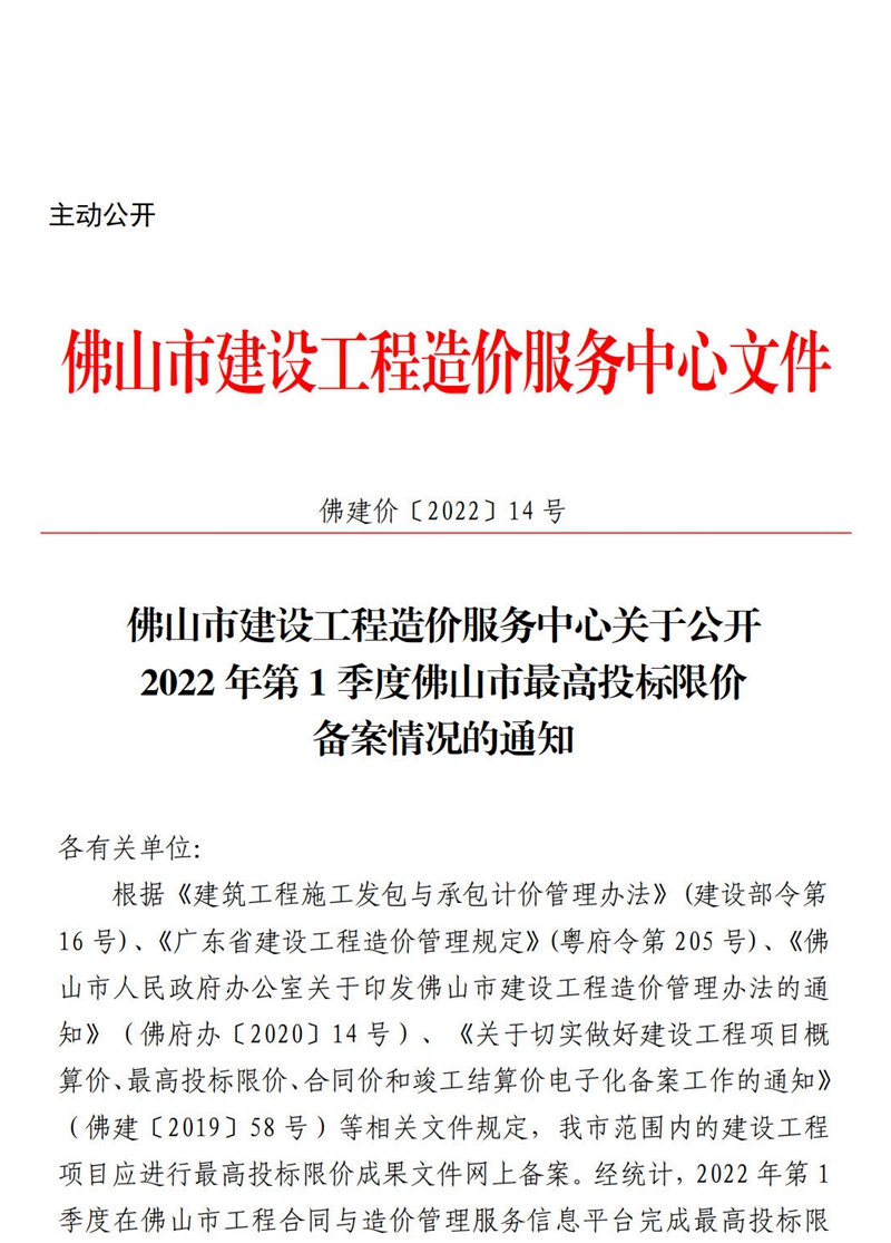 佛山市建設工程造價服務中心關于公開2022年第1季度佛山市最高投標限價備案情況的通知