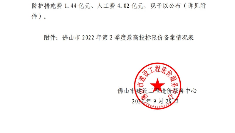 佛山市建設工程造價服務中心關于公開2022年第2季度佛山市最高投標限價備案情況的通知