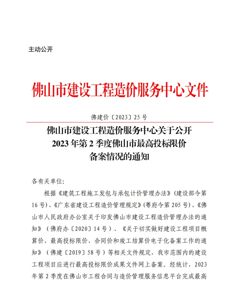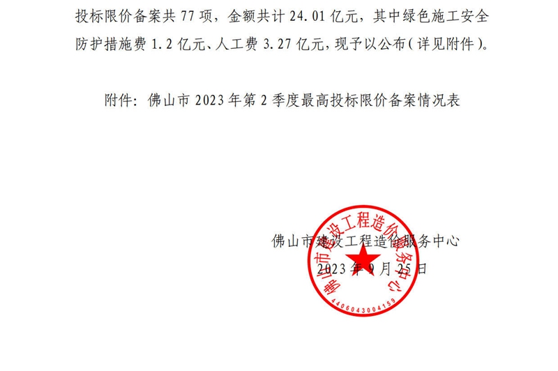 佛山市建設工程造價服務中心關于公開2023年第2季度佛山市最高投標限價備案情況的通知