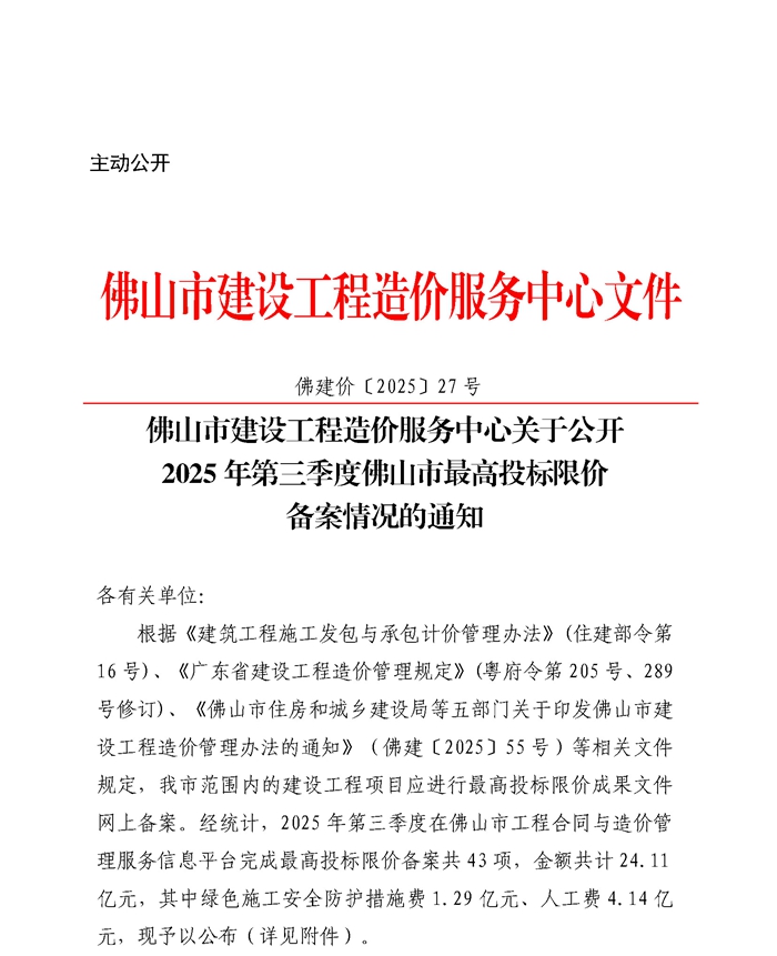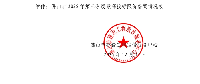 轉發 | 佛山市建設工程造價服務中心關于公開2025年第三季度佛山市最高投標限價備案情況的通知