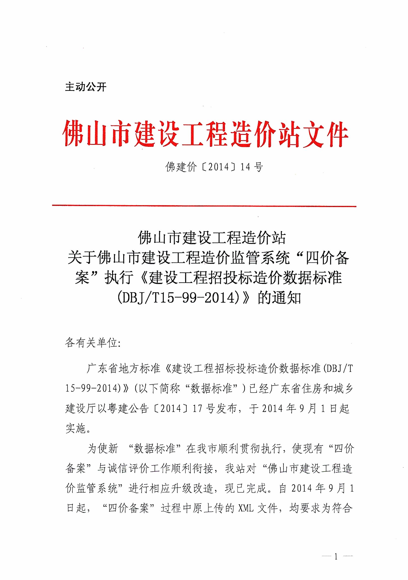 關(guān)于佛山市建設(shè)工程造價(jià)監(jiān)管系統(tǒng)“四價(jià)備案”執(zhí)行《建設(shè)工程招投標(biāo)造價(jià)數(shù)據(jù)標(biāo)準(zhǔn)(DBJ/T15-99-2014)》的通知