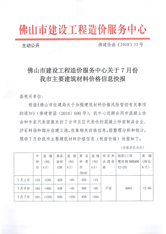 佛山市建設工程造價服務中心關于7月份我市主要建筑材料價格信息快報