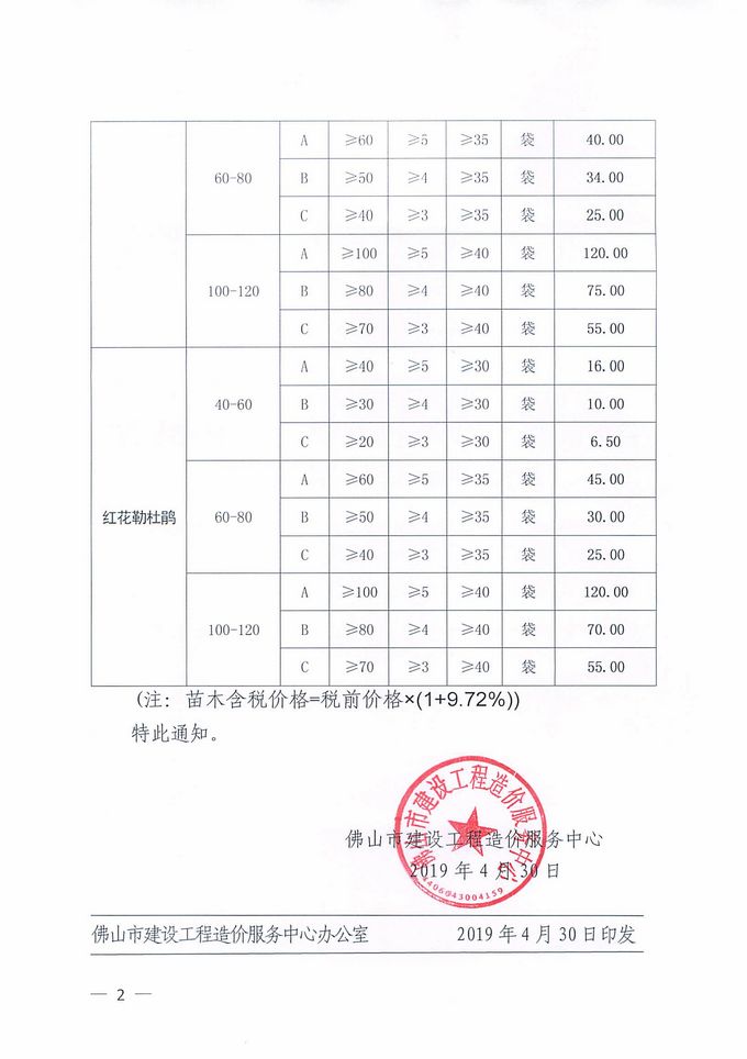佛山市建設工程造價服務中心關于補充發布2019年第一季度勒杜鵑材料分級價格信息的通知