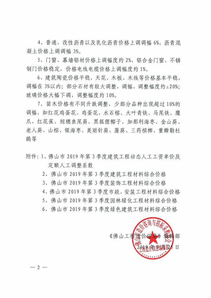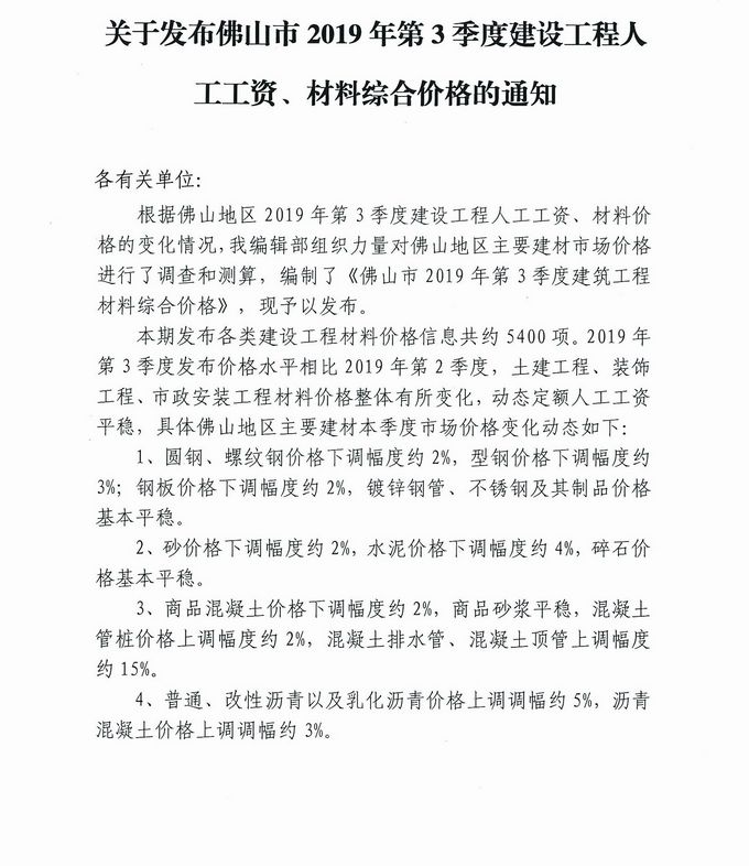 關于發布佛山市2019年第3季度建設工程人工工資、材料綜合價格的通知