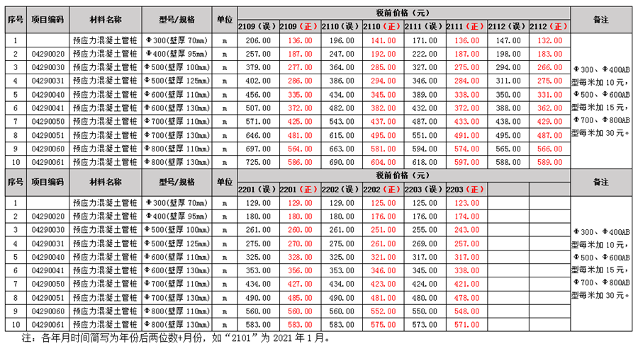 《佛山工程造價(jià)信息》2021年第1季度~2022年第1季度預(yù)應(yīng)力混凝土管樁價(jià)格信息勘誤表