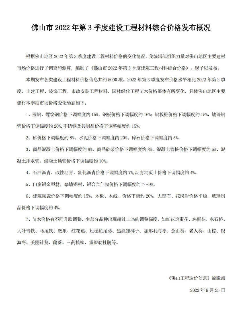 佛山市2022年第3季度建設工程材料綜合價格發布概況