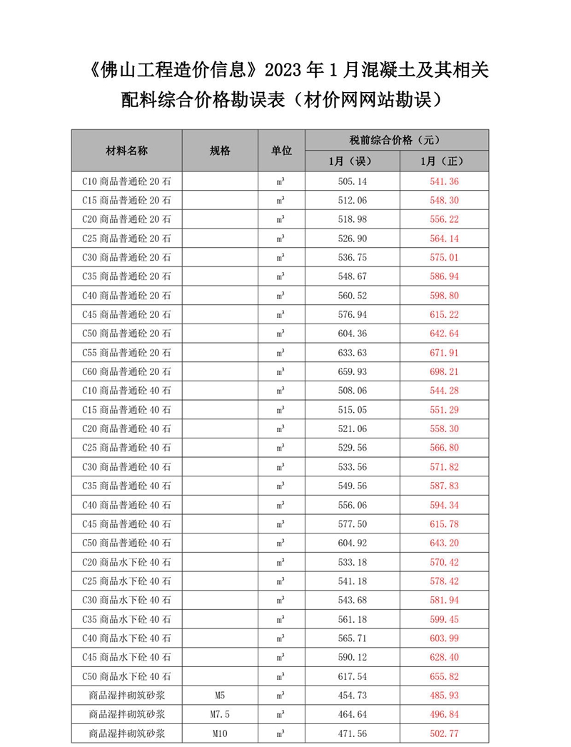 《佛山工程造價(jià)信息》2023年1月混凝土及其相關(guān)配料綜合價(jià)格勘誤表(材價(jià)網(wǎng)網(wǎng)站勘誤)
