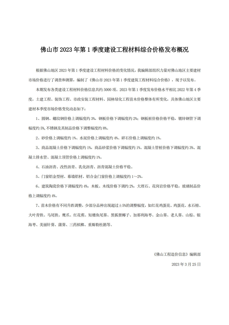 佛山市2023年第1季度建設工程材料綜合價格發布概況