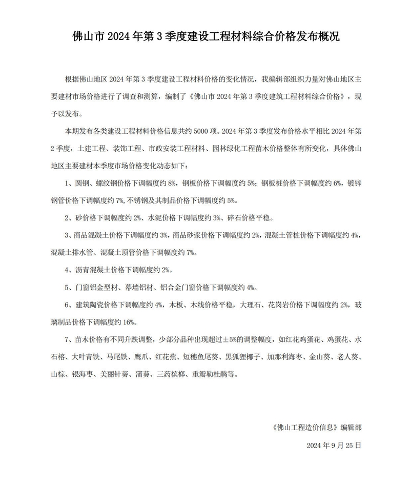 佛山市2024年第3季度建設工程材料綜合價格發布概況