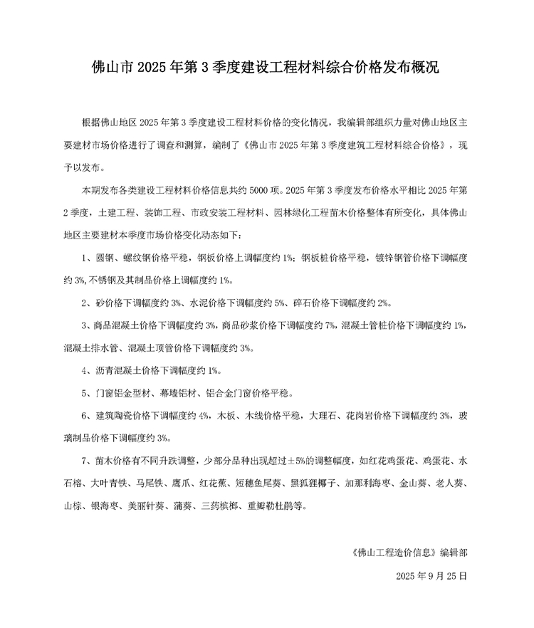 佛山市2025年第3季度建設(shè)工程材料綜合價(jià)格發(fā)布概況