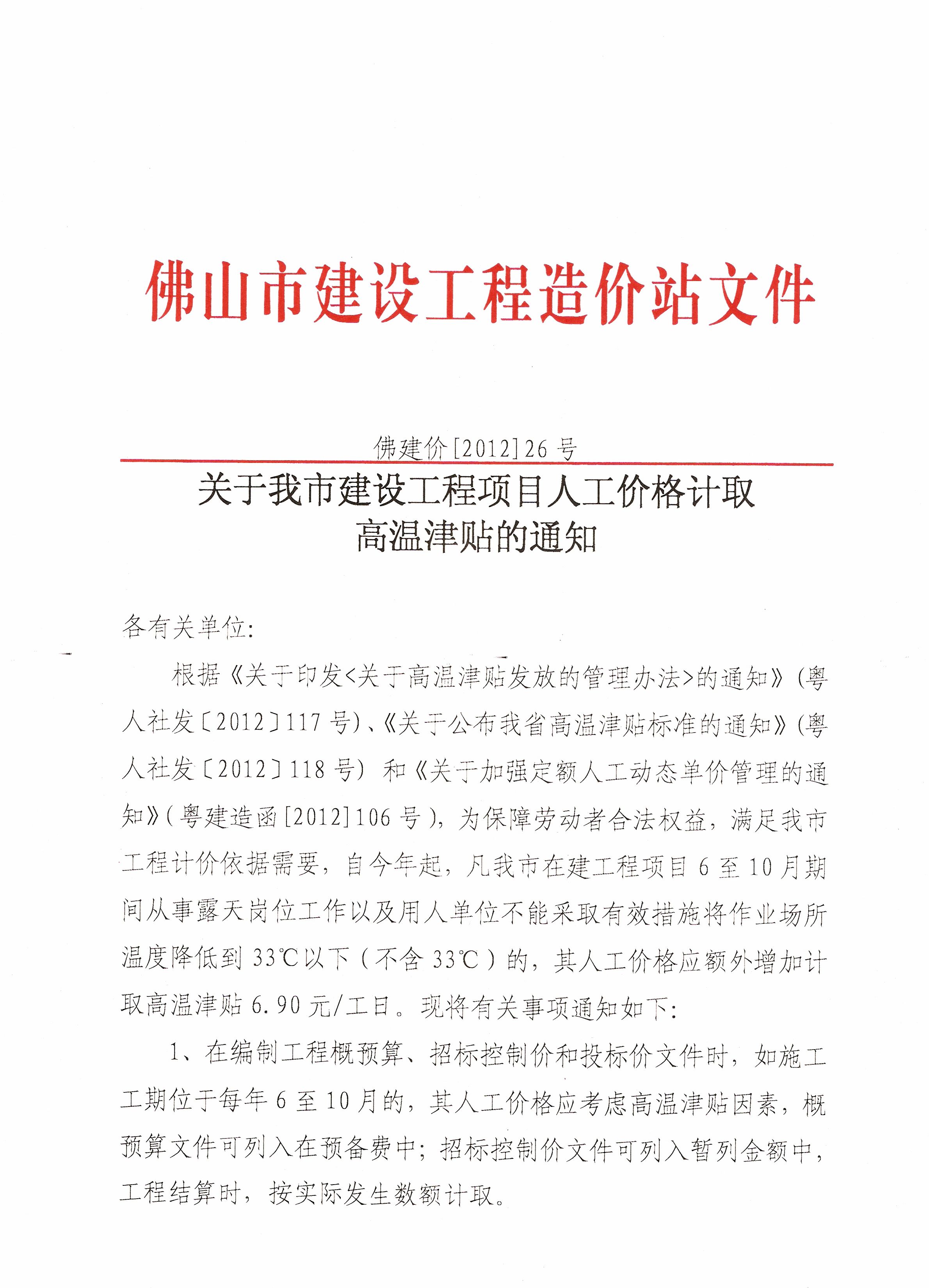 關(guān)于我市建設(shè)工程項(xiàng)目人工價(jià)格計(jì)取高溫津貼的通知