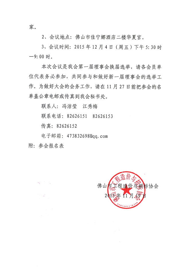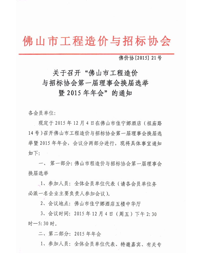 關(guān)于召開“佛山市工程造價(jià)與招標(biāo)協(xié)會第一屆理事會換屆選舉暨2015年年會”的通知