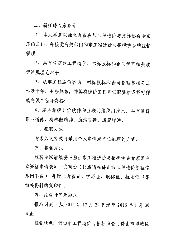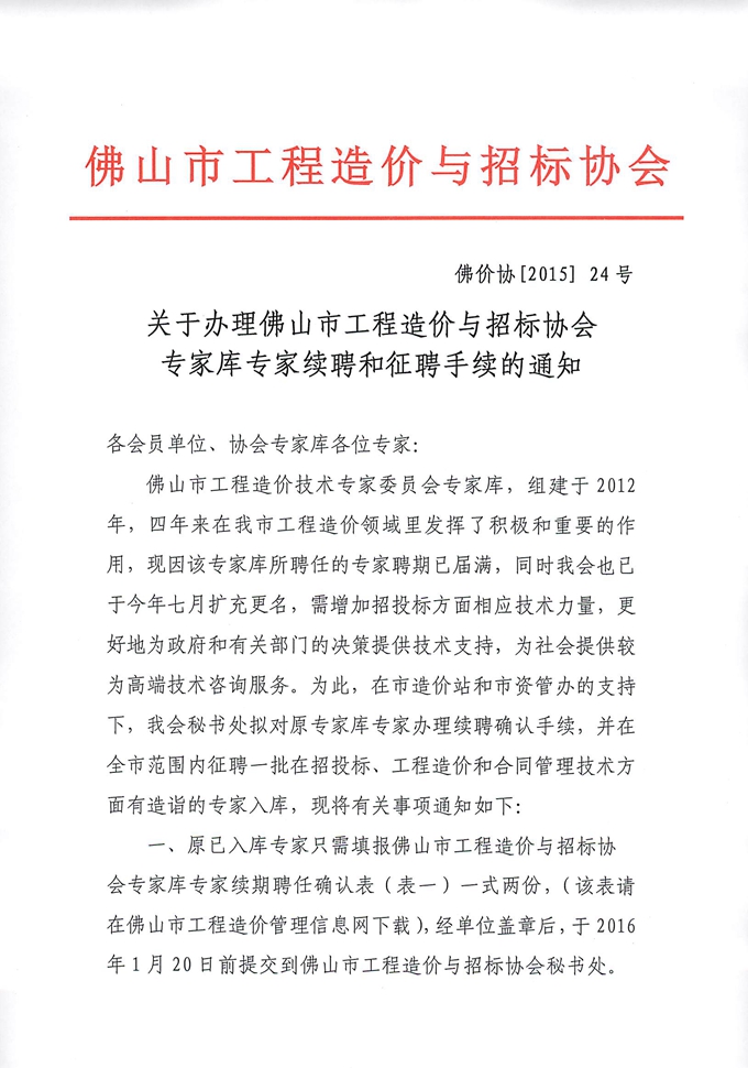 關(guān)于辦理佛山市工程造價與招標協(xié)會專家?guī)鞂<依m(xù)聘和征聘手續(xù)的通知