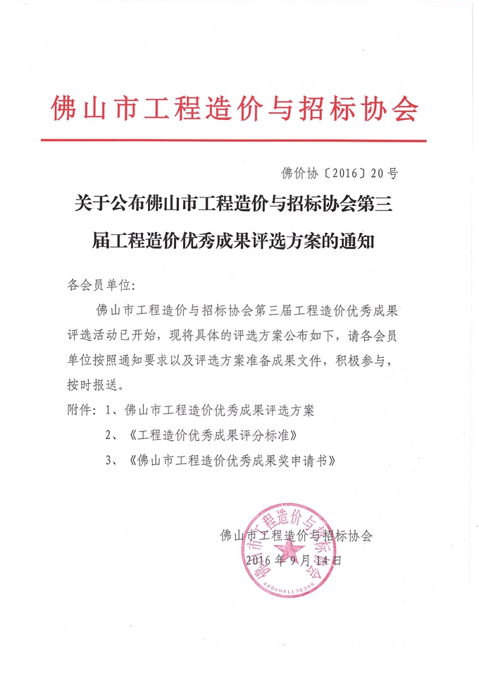 關(guān)于公布佛山市工程造價(jià)與招標(biāo)協(xié)會(huì)第三屆工程造價(jià)優(yōu)秀成果評(píng)選方案的通知