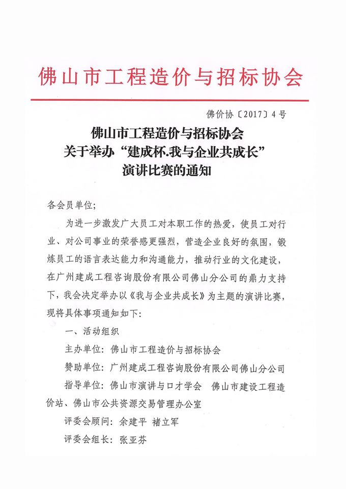 佛山市工程造價與招標協會關于舉辦“建成杯.我與企業共成長”演講比賽的通知