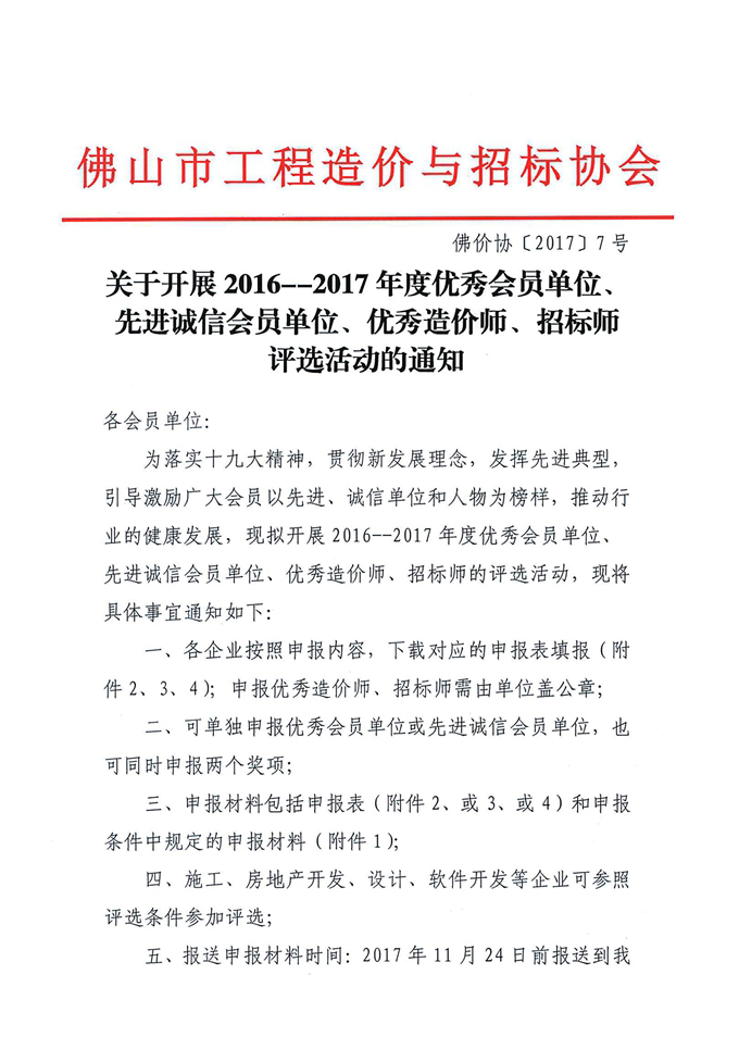 關于開展2016--2017年度優秀會員單位、先進誠信會員單位、優秀造價師、招標師評選活動的通知