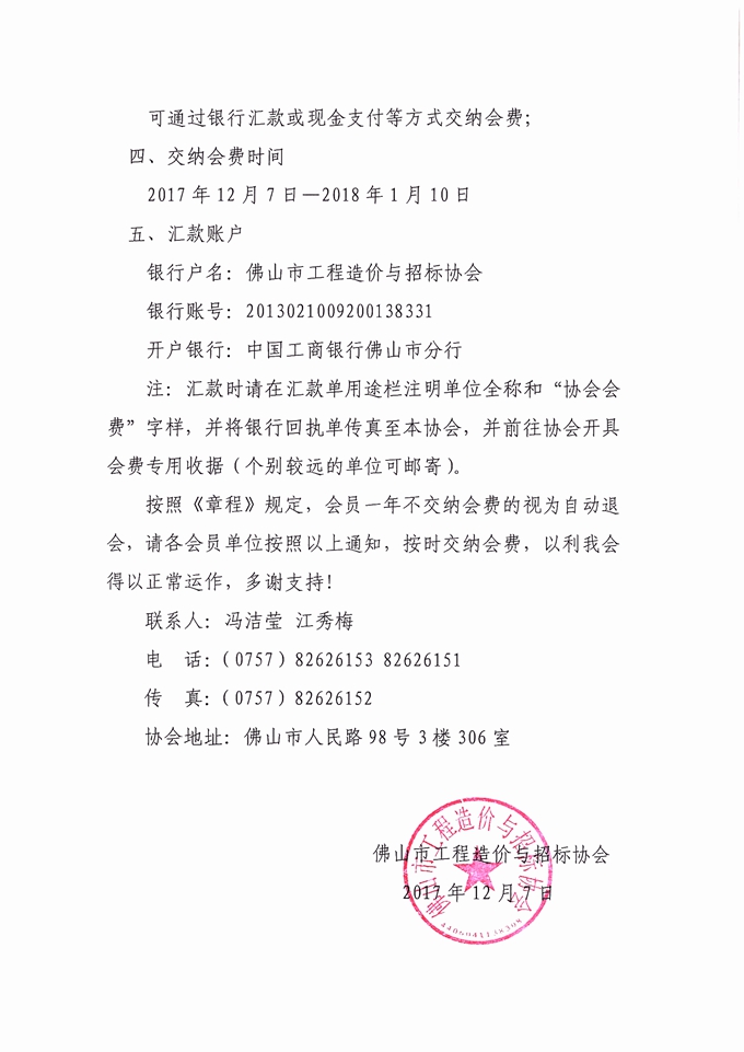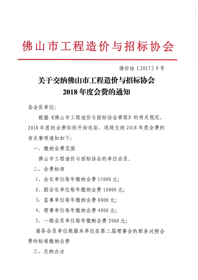 關于交納佛山市工程造價與招標協會2018年度會費的通知