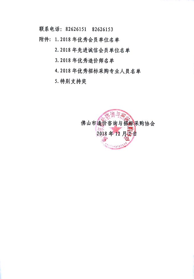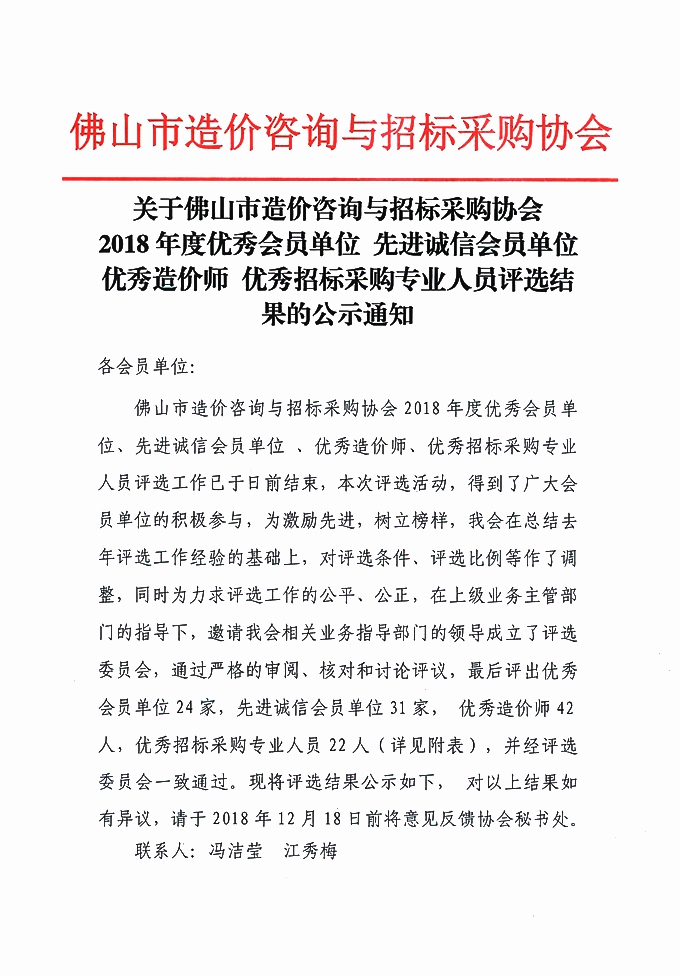 關于佛山市造價咨詢與招標采購協會2018年度優秀會員單位 先進誠信會員單位 優秀造價師 優秀招標采購專業人員評選結果的公示通知