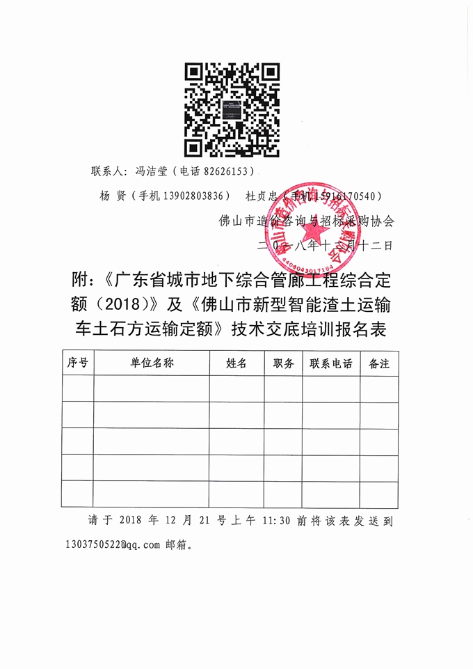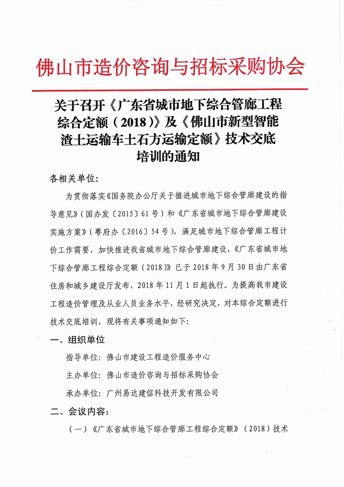 關于召開《廣東省城市地下綜合管廊工程綜合定額(2018)》及《佛山市新型智能渣土運輸車土石方運輸定額》技術交底培訓的通知