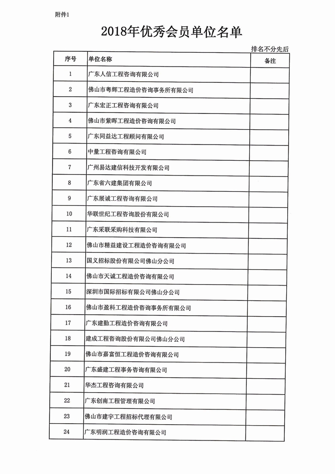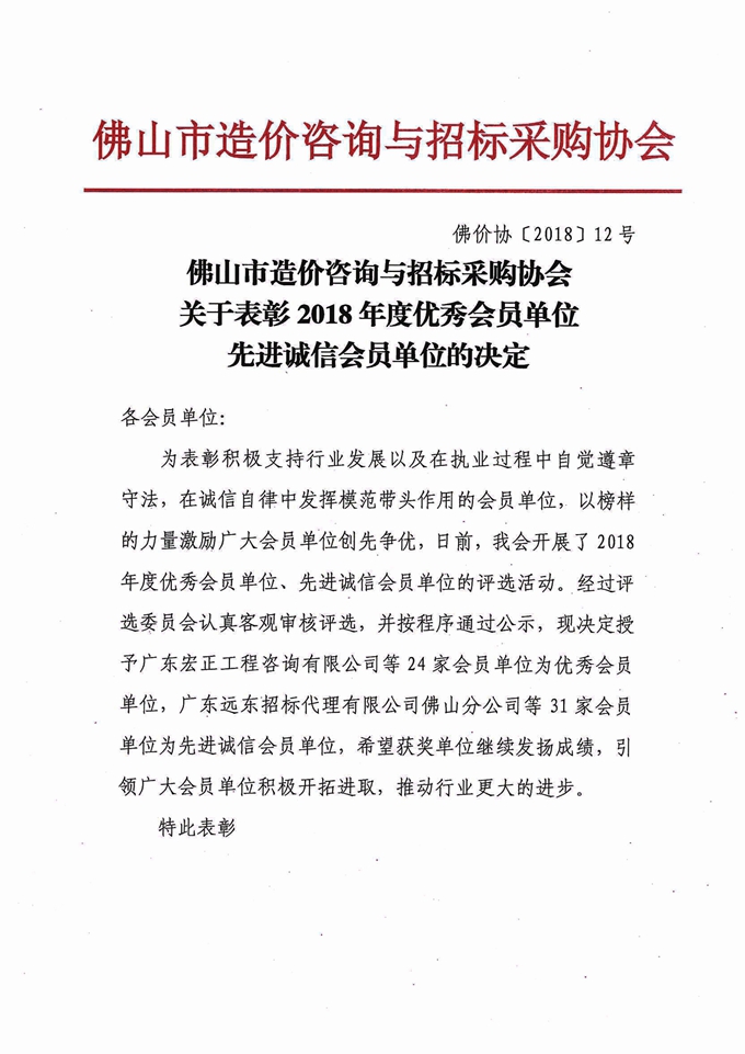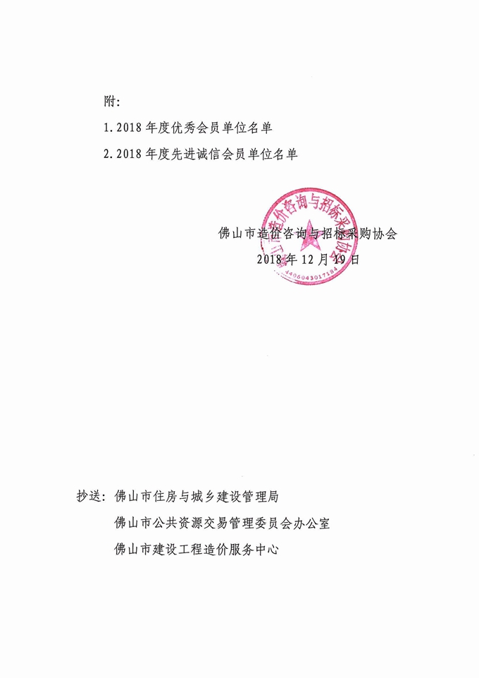 佛山市造價咨詢與招標采購協會關于表彰2018年度優秀會員單位 先進誠信會員單位的決定