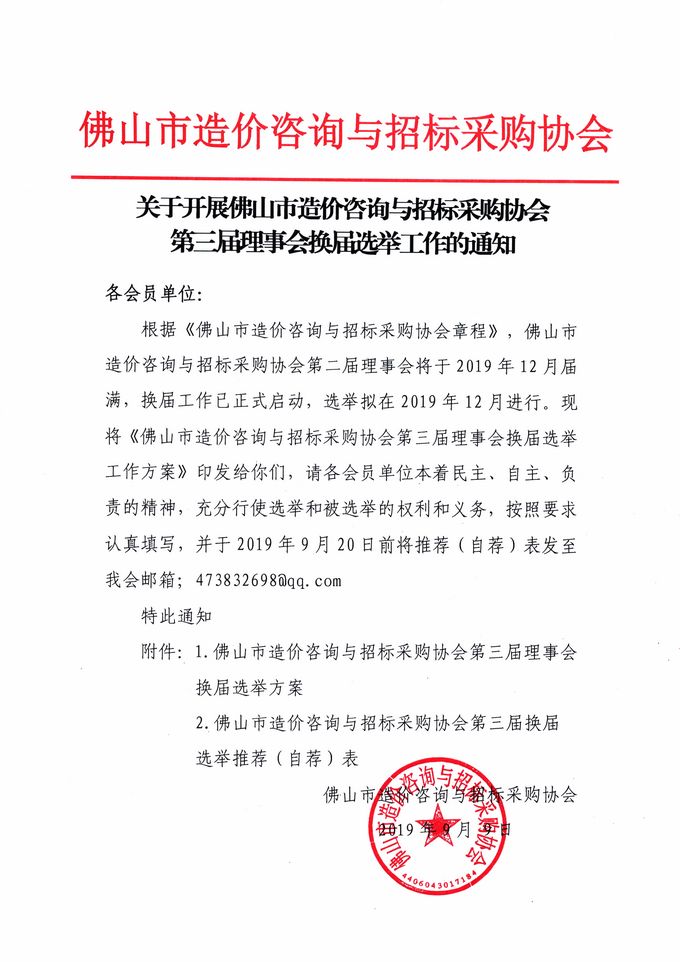 關于開展佛山市造價咨詢與招標采購協會第三屆理事會換屆選舉工作的通知