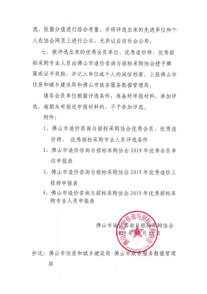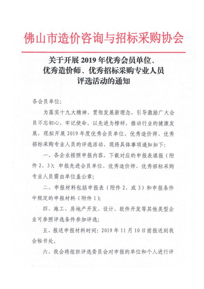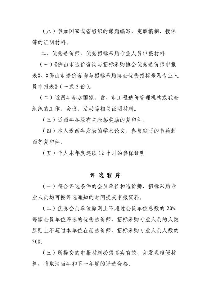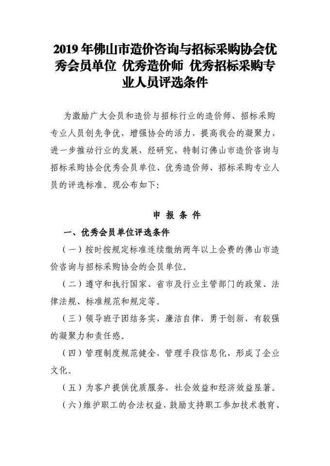 附件1、2019年佛山市造價咨詢與招標采購協會優秀會員單位 優秀造價師 優秀招標采購專業人員評選條件