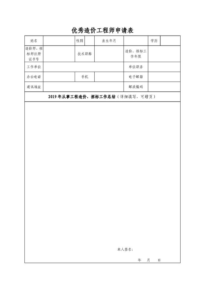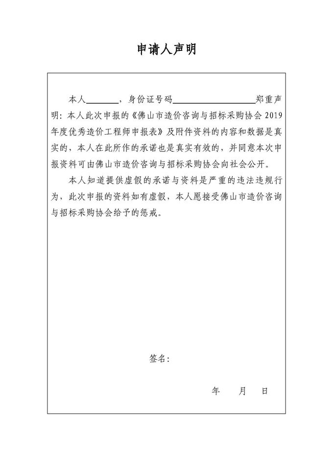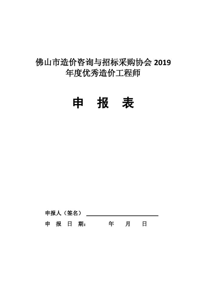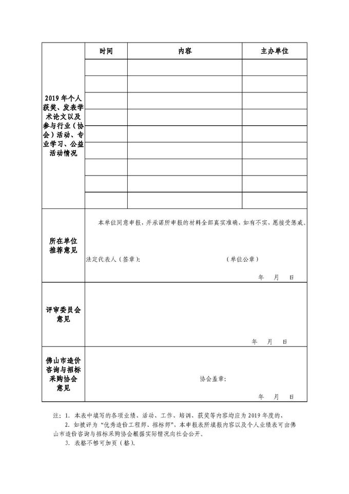 附件3、佛山市造價咨詢與招標采購協會2019年度優秀造價工程師申 報 表