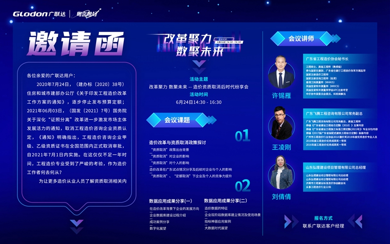 為讓更多造價從業人員了解資質取消相關內容,了解行業內數字化實踐思路,特此舉辦《改革聚力  數聚未來--- 造價資質取消后時代線上紛享會》,會議將于2021年6月24日下午線上舉辦,屆時廣東造價行業從業人員線上參與本次活動。現將有關事項通知如下: