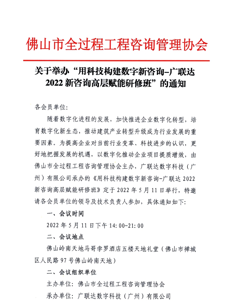 關于舉辦“用科技構建數字新咨詢-廣聯達2022新咨詢高層賦能研修班”的通知