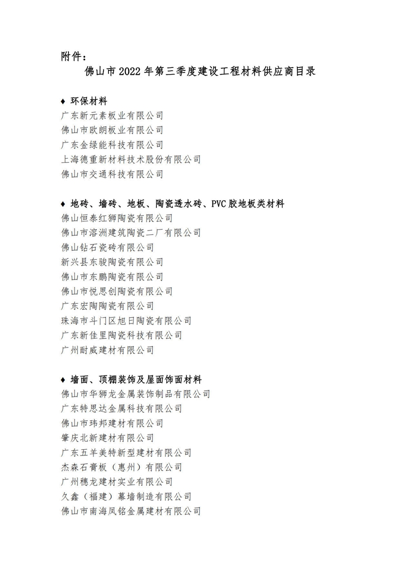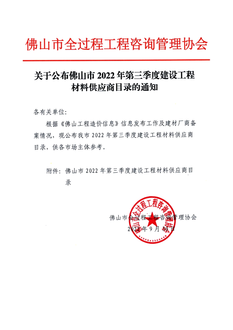 關(guān)于公布佛山市2022年第三季度建設(shè)工程材料供應(yīng)商目錄的通知