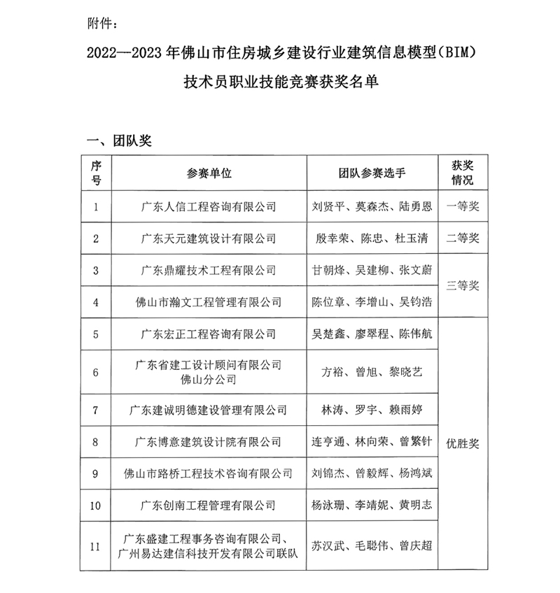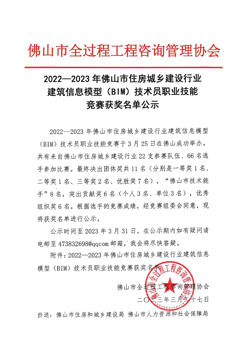 2022—2023年佛山市住房城鄉(xiāng)建設(shè)行業(yè)建筑信息模型(BIM)技術(shù)員職業(yè)技能競(jìng)賽獲獎(jiǎng)名單公示