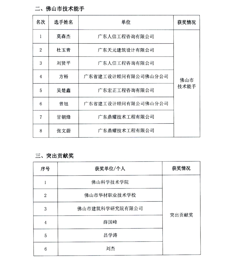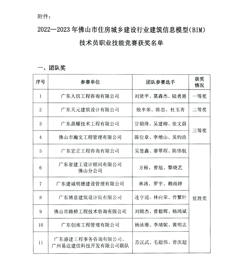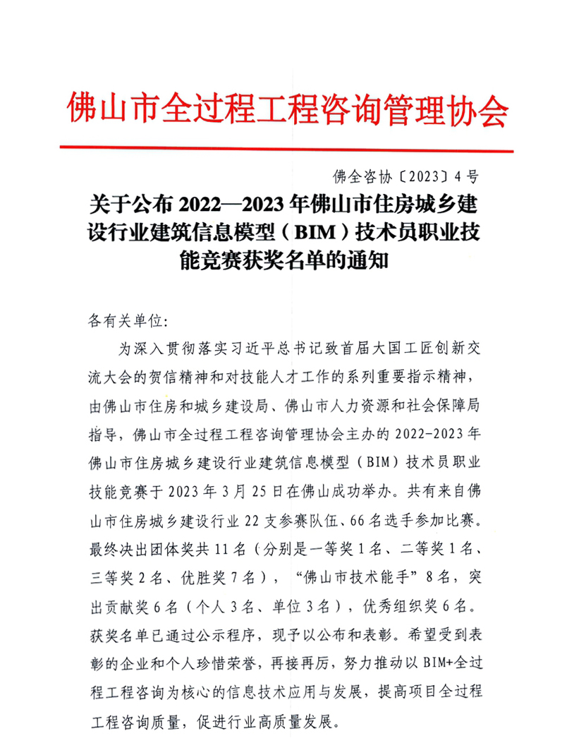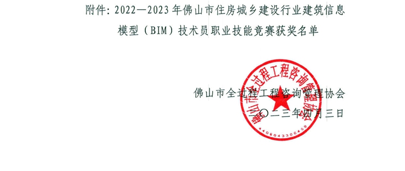 關于公布2022—2023年佛山市住房城鄉建設行業建筑信息模型(BIM)技術員職業技能競賽獲獎名單的通知